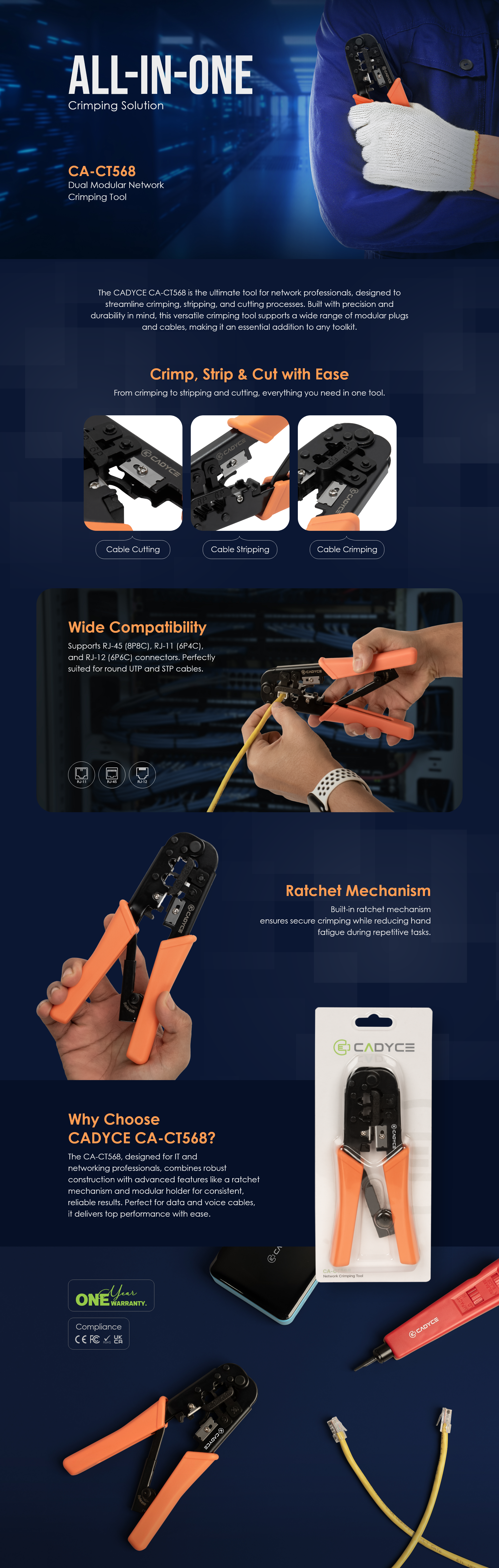 Cadyce CA-CT568, Network Crimping Tool allows you to crimp, strip & cut efficiently