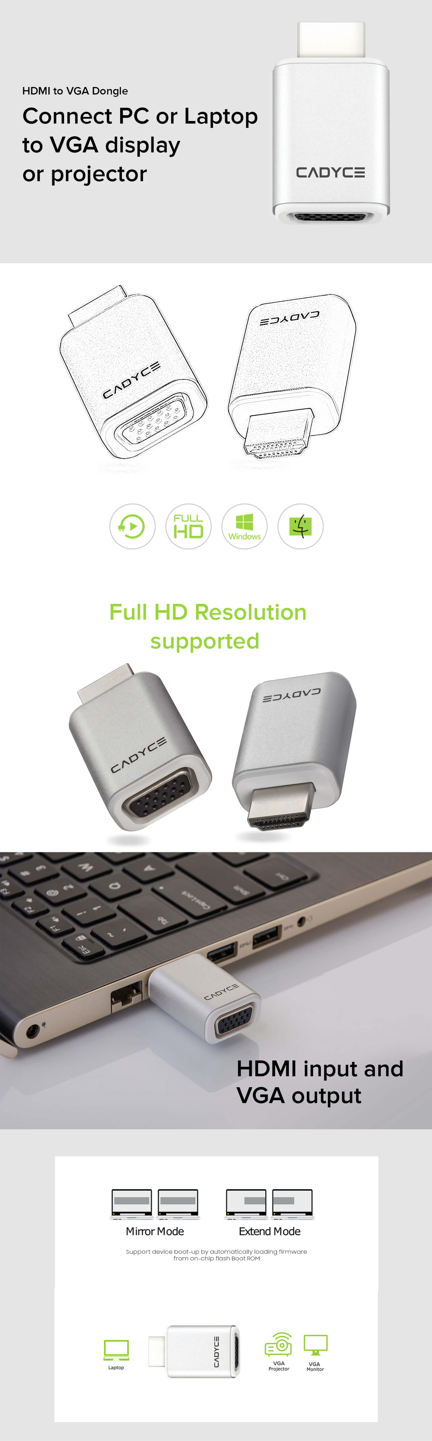 Cadyce HDMI to VGA Dongle, connects your HDMI source such as PC or Laptop to a VGA display or projector.