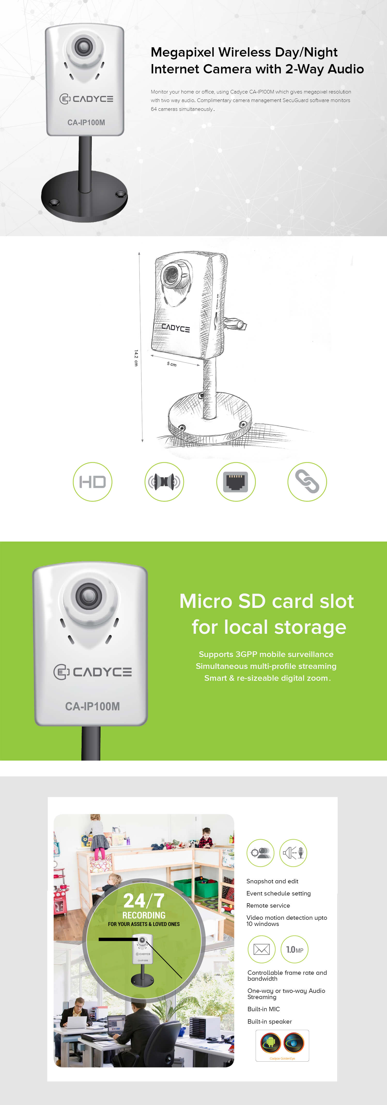 Monitor your Home or Office, using Cadyce CA-IP100M which gives Mega-Pixel resolution with two way audio. Complimentary camera management SecuGuard software monitors 64 cameras simultaneously.
