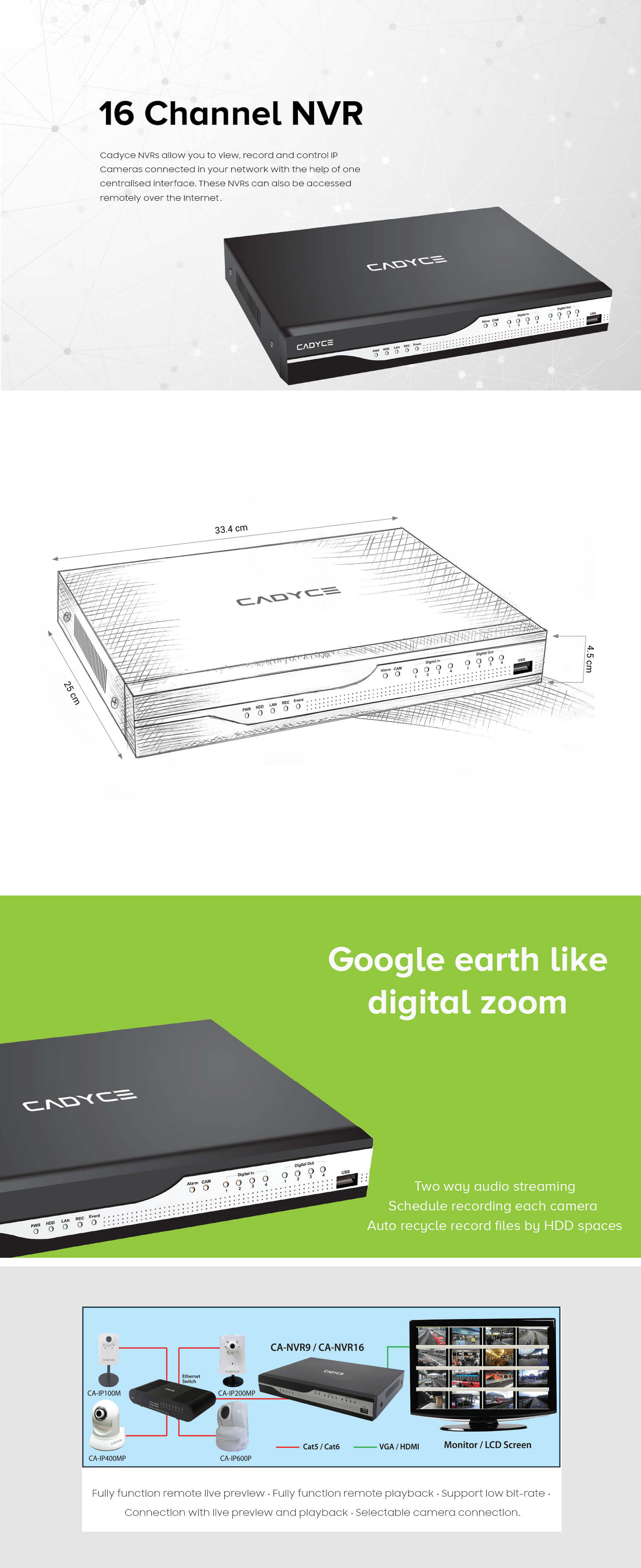 Cadyce NVRs allows you to view, record and control IP Cameras connected in your network with the help of one centralised interface. These NVRs can also be accessed remotely over the Internet.