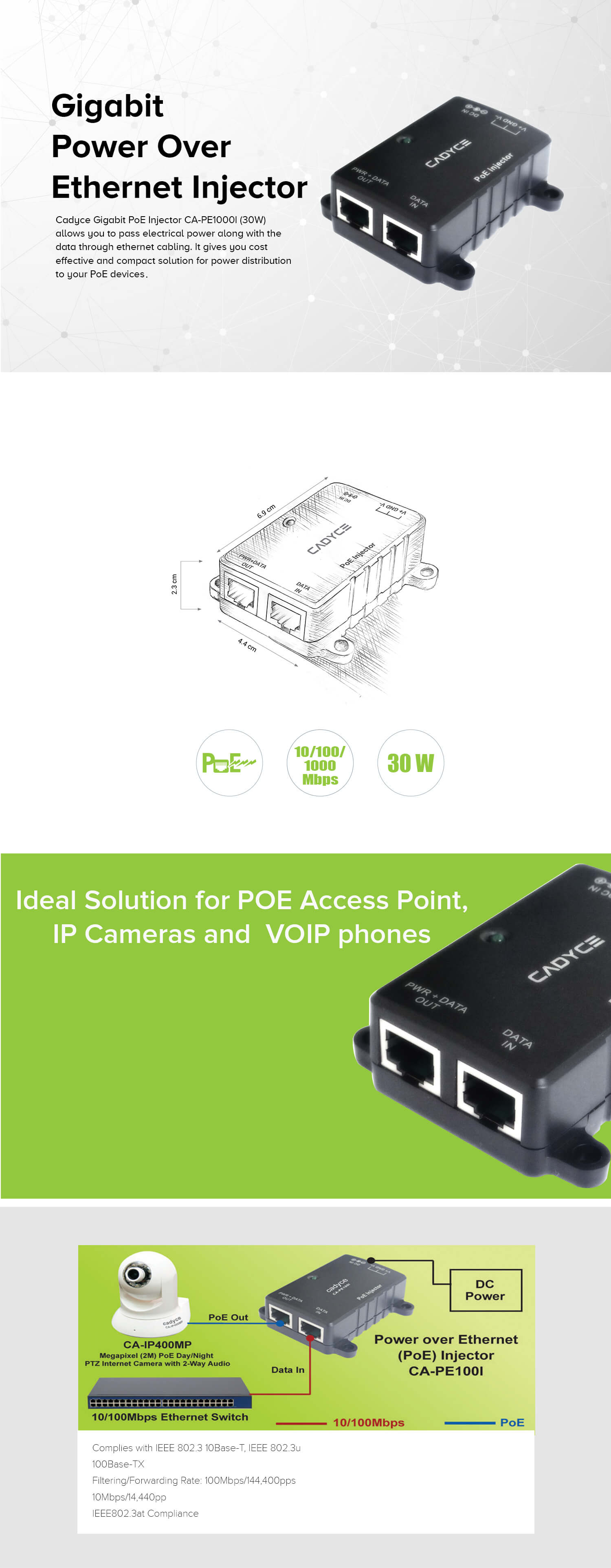 Cadyce Gigabit PoE Injector CA-PE1000I (30W) allows you to pass electrical power along with the data on Ethernet cabling. It gives you cost effective and compact solution for power distribution to your PoE devices.