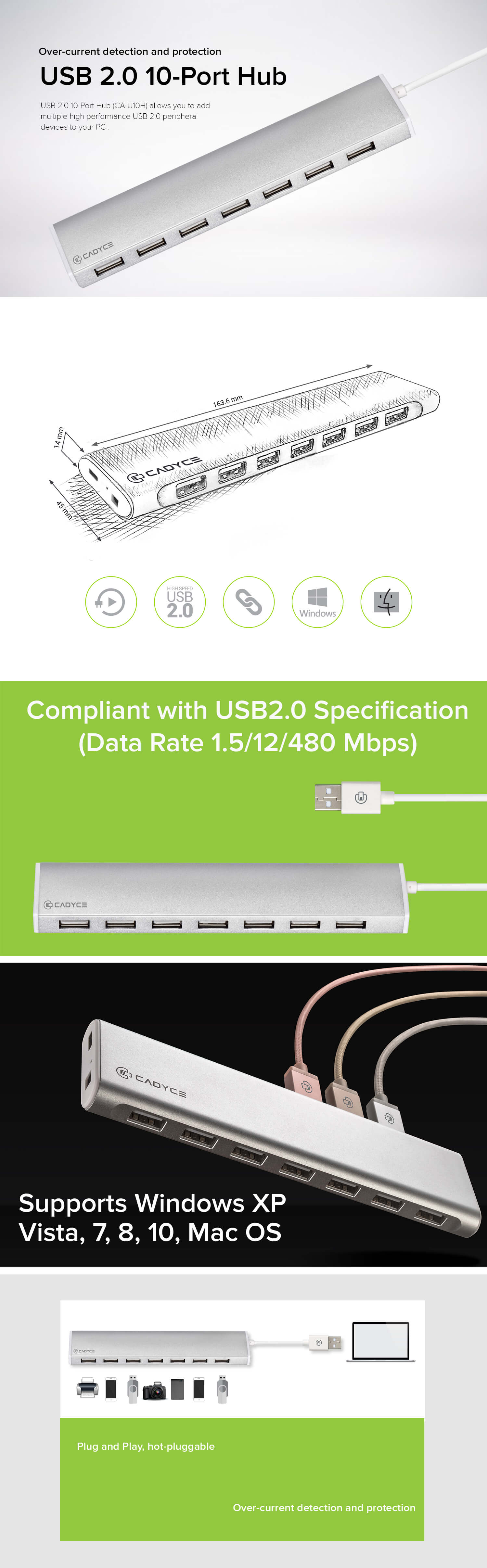 USB 2.0 10-Port Hub (CA-U10H) allows you to add multiple high performance USB 2.0 peripheral devices to your PC.