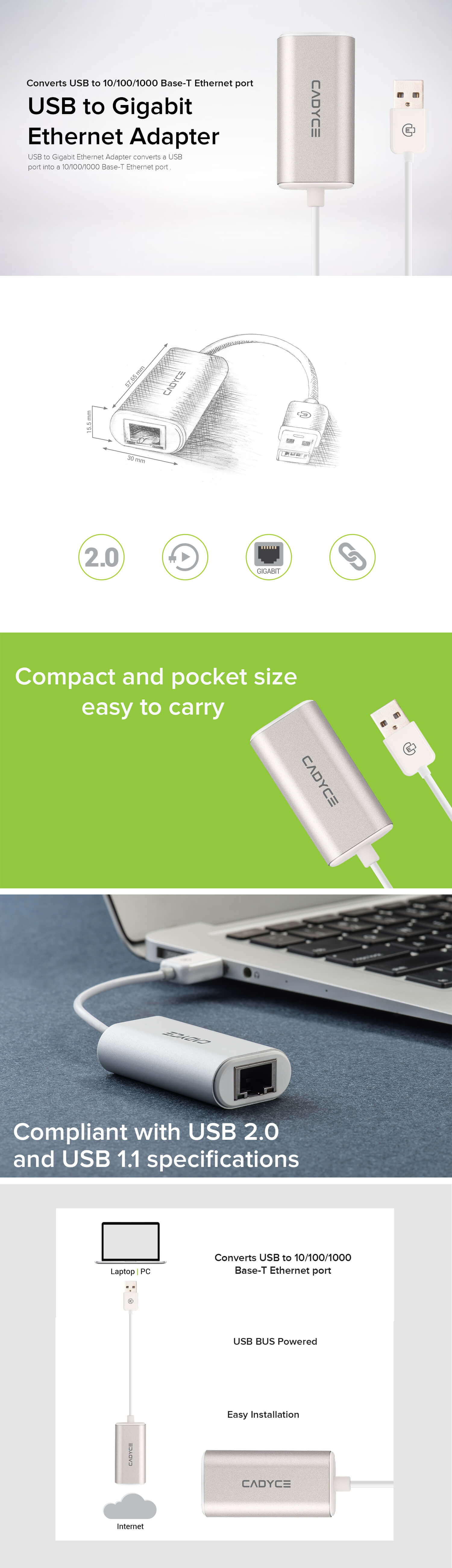 • Converts USB to 10/100/1000 Base-T Ethernet port