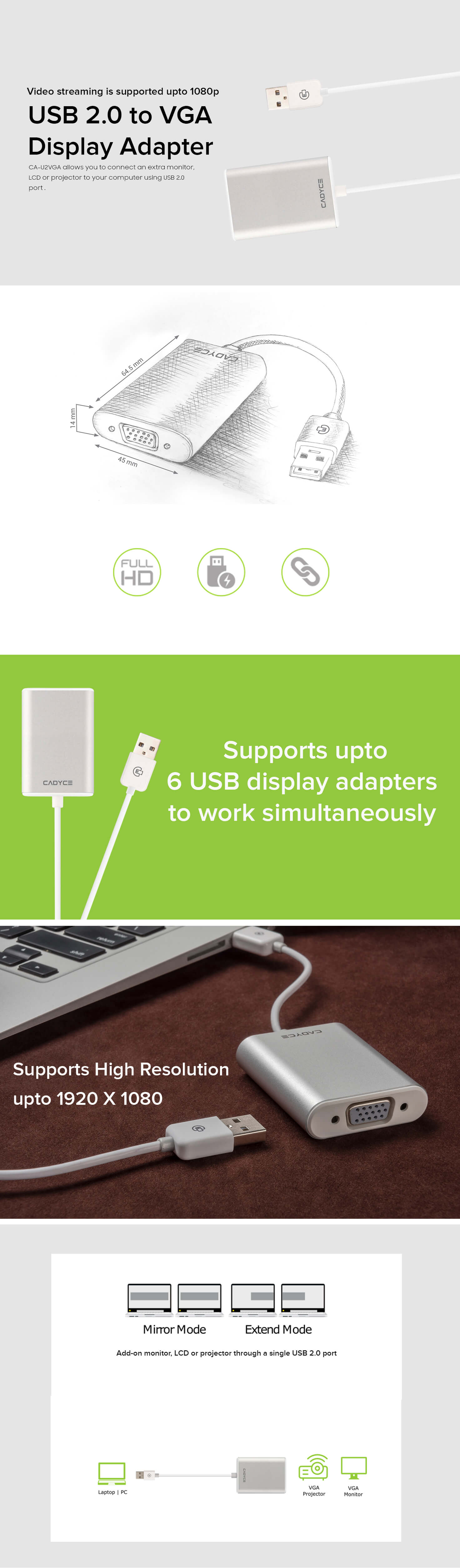 CA-U2VGA allows you to connect an extra monitor, LCD or projector to your computer using USB 2.0 port.