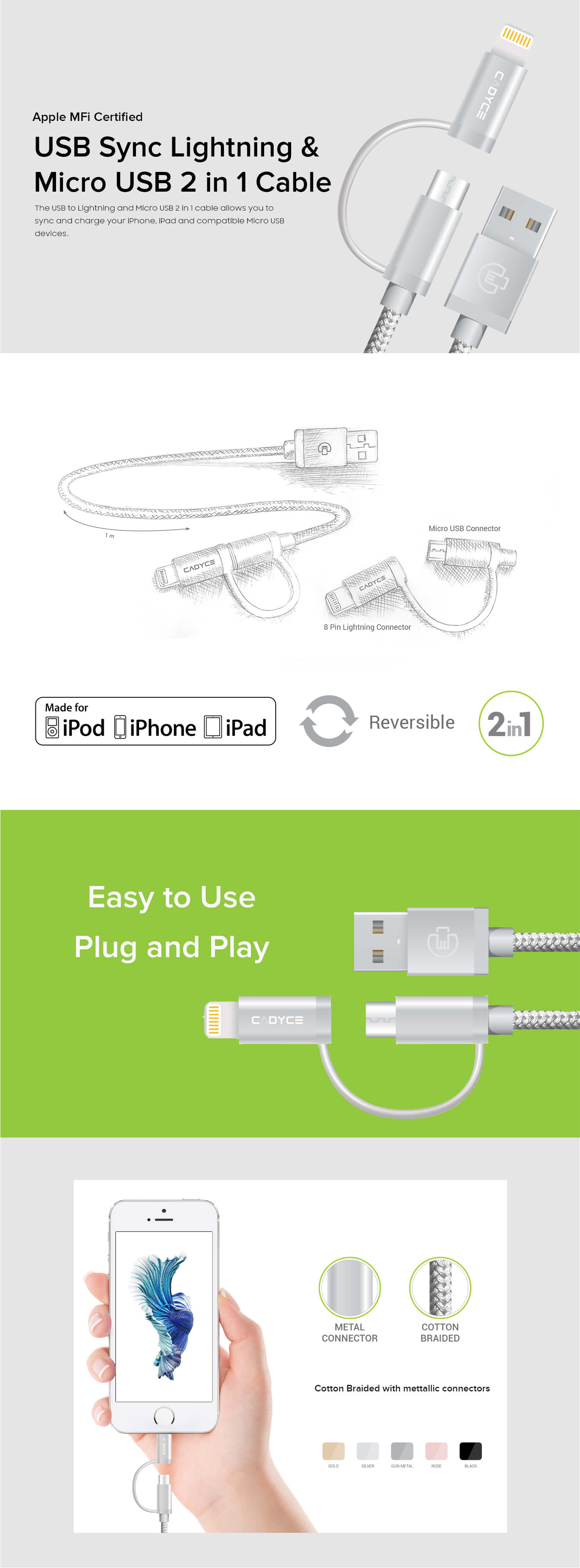 The USB to Lightning and Micro USB 2 in 1 cable allows you to sync and charge your iPhone, iPad, iPod and compatible Micro USB devices.