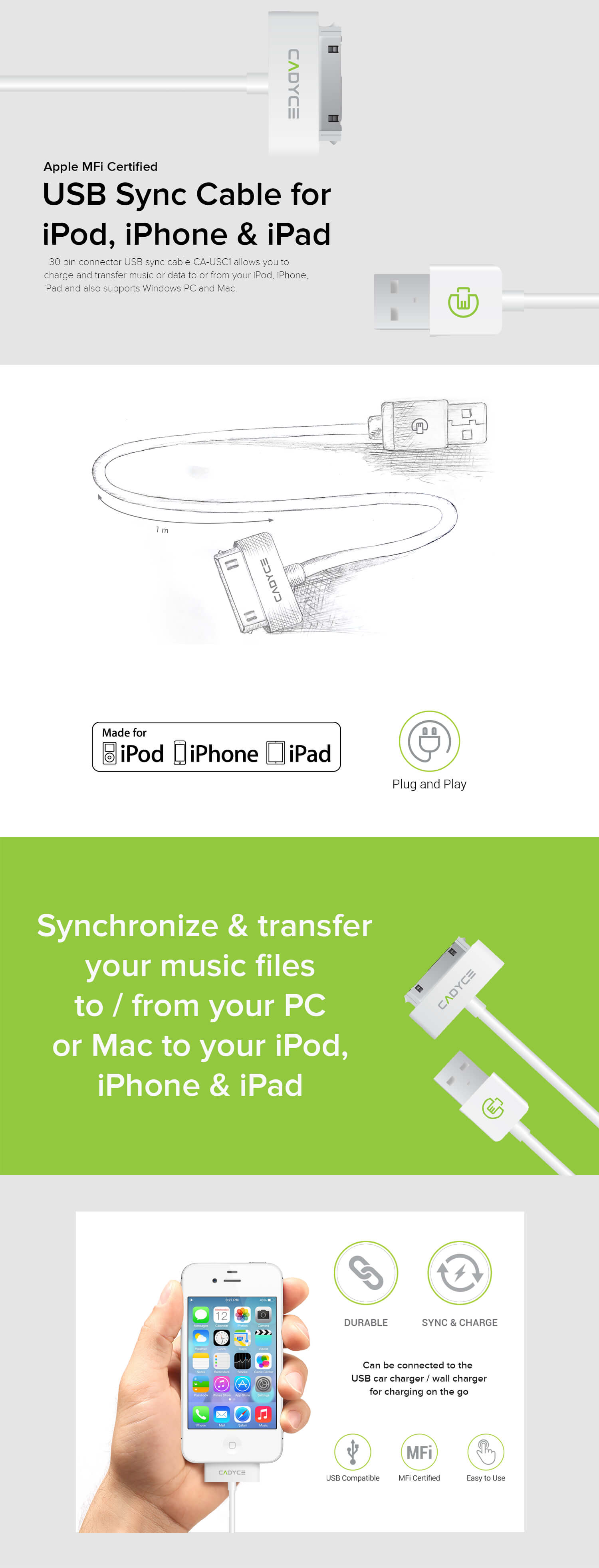 USB Sync Cable with 30 pin connector, CA-USC1 allows you to charge and transfer music or data to or from your iPod, iPhone, iPad and also supports Windows PC and Mac.