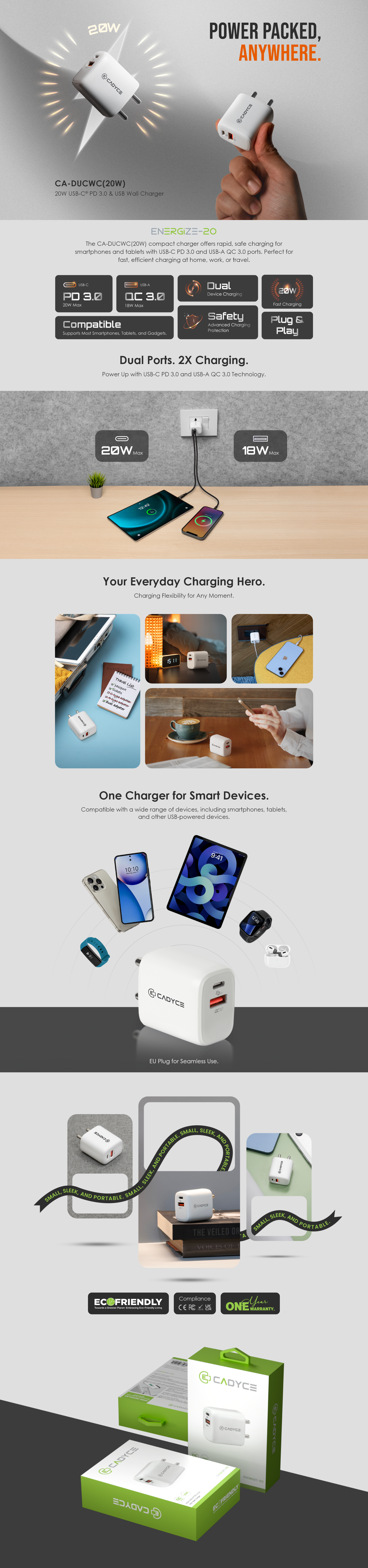 | Features | • High-Speed Charging • Supports simultaneous charging • Wide compatibility • Safe charging with high efficiency • Compact and elegant • Supports QC 3.0 |