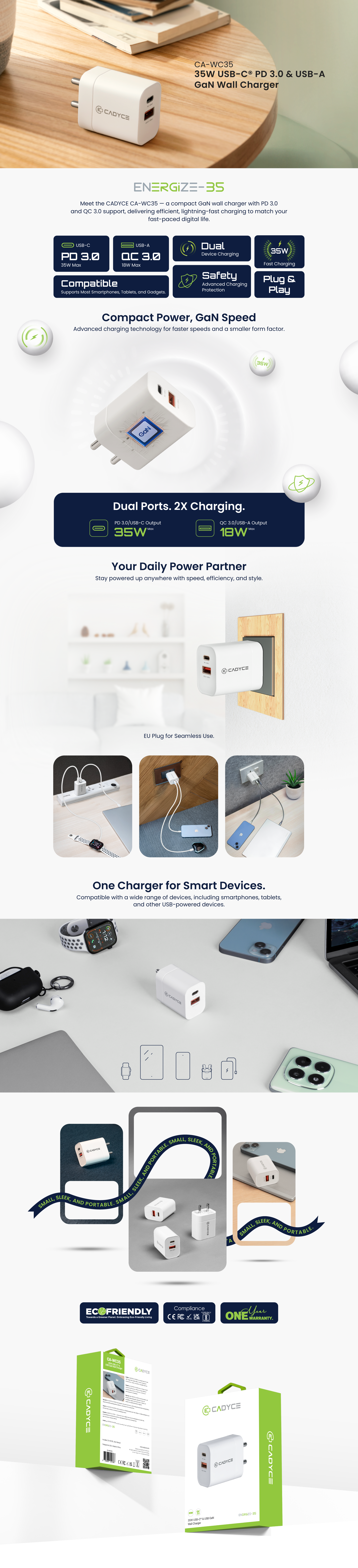 CADYCE CA-WC35 is a compact and efficient wall charger that safely delivers faster charging for smartphones, tablets, and other compatible devices.