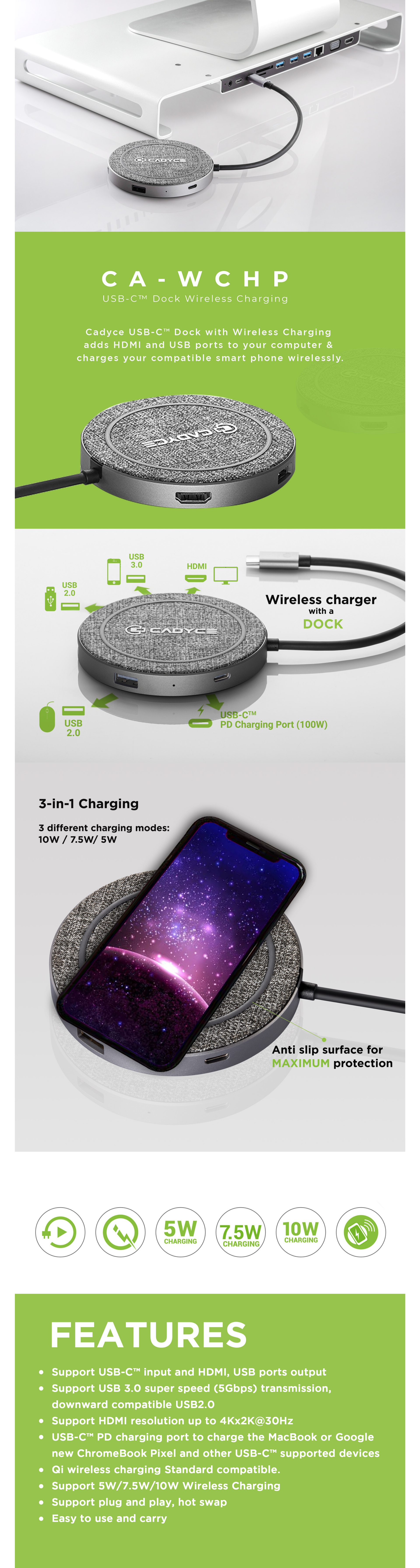 Features • Support USB-C™ input and HDMI, USB ports output • Support USB 3.0 super speed (5Gbps) transmission, downward compatible USB2.0 • Support HDMI resolution up to 4Kx2K@30Hz • USB-C™ PD charging port to charge the MacBook or Google new ChromeBook Pixel and other USB-C™ supported devices • Qi wireless charging Standard compatible. • Support 5W/7.5W/10W Wireless Charging • Support plug and play, hot-swap • Easy to use and carry