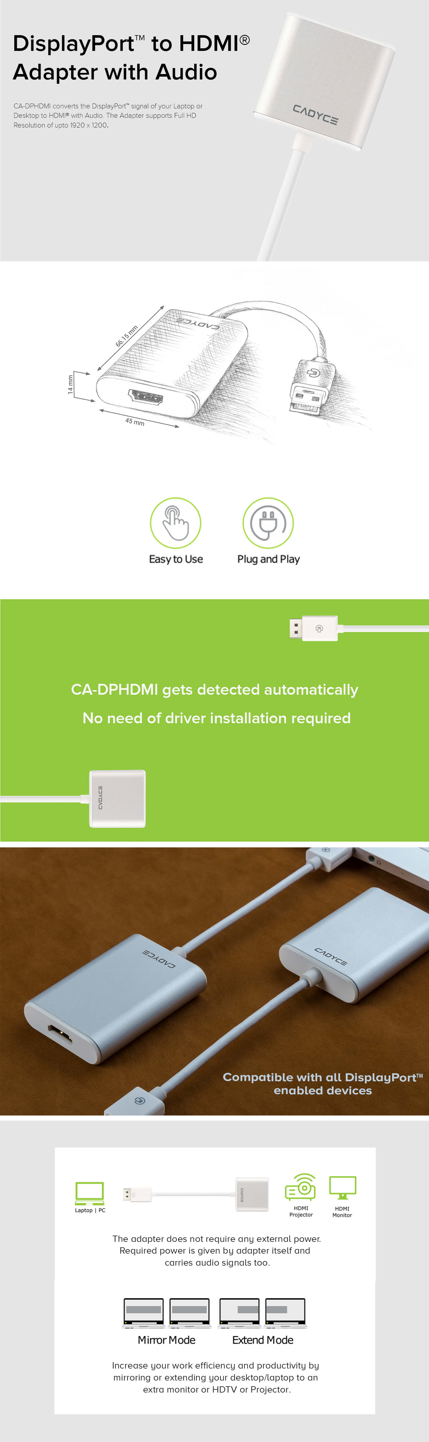 | Model | DisplayPort™ to HDMI® Adapter (CA-DPHDMI) |