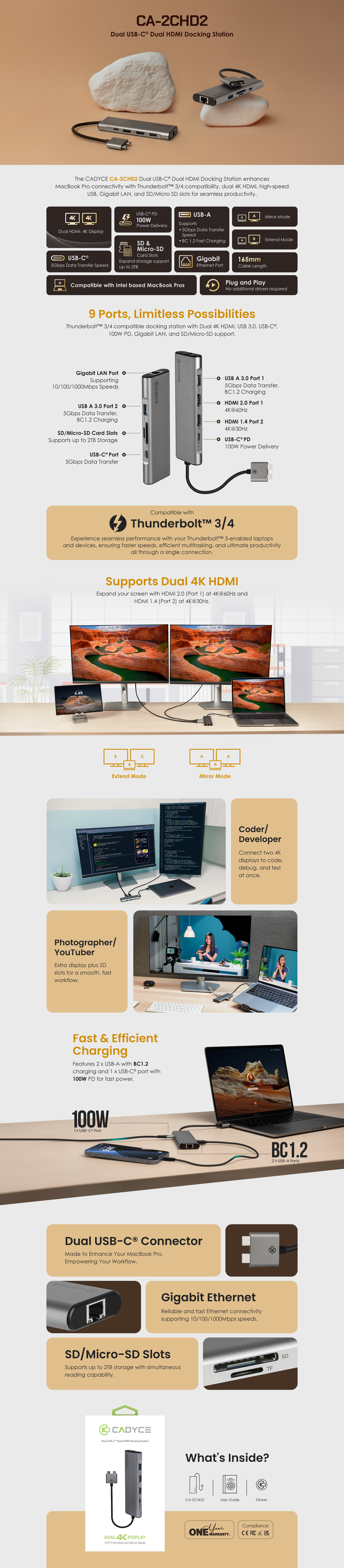 | Features | • HDMI 2.0 Port1 Resolution up to 4K x 2K@60Hz • HDMI 1.4 Port2 Resolution up to 4K x 2K@30Hz • 5Gbps Data Transfer through USB 3.0 ports • USB 3.0 ports support BC1.2 charging • Gigabit LAN • Compatible with Mac OS and Windows • SD / Micro-SD Card Storage up to 2TB • USB-C™ data transfer up to 5Gbps • USB-C™ Power Delivery up to 100W |