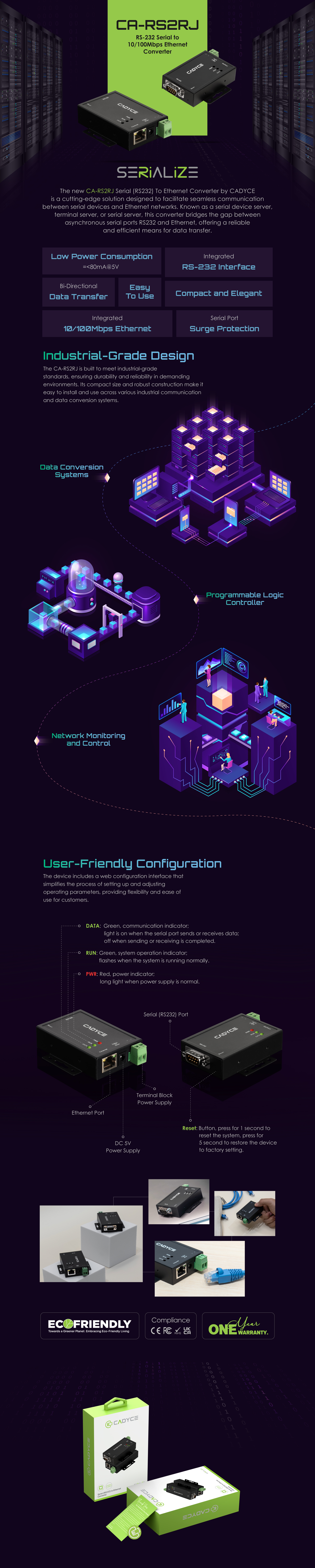 Unlock the full potential of CADYCE CA-RS2RJ which seamlessly bridges RS-232 Serial interface to 10/100Mbps Ethernet, enhancing connectivity with reliability and performance.
