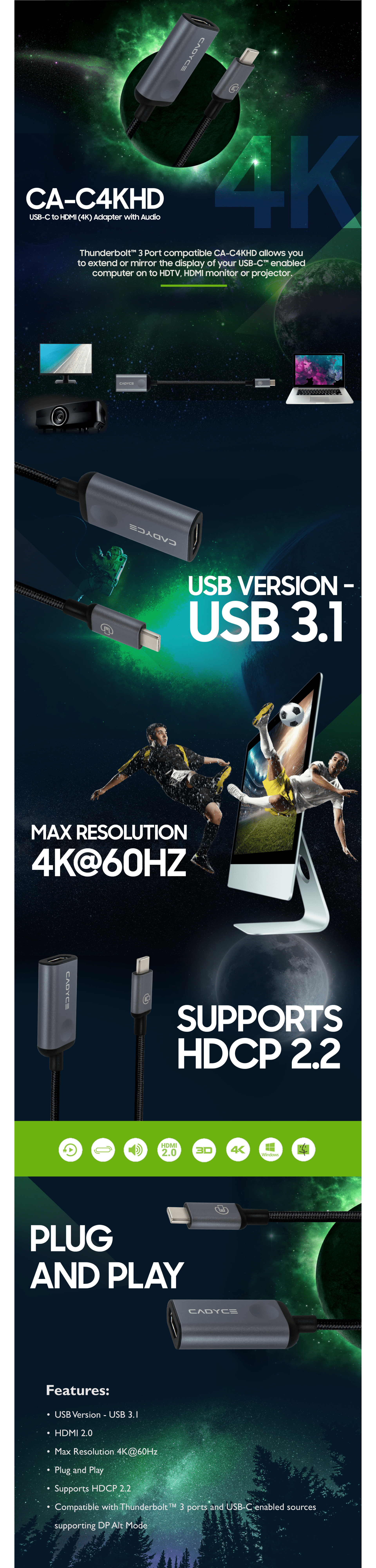 | Features | • USB Version – USB 3.1 • HDMI 2.0 • Max Resolution 4K@60Hz • Plug and Play • Supports HDCP 2.2 • Compatible with Thunderbolt™ 3 ports and USB-C enabled sources supporting DP Alt Mode |