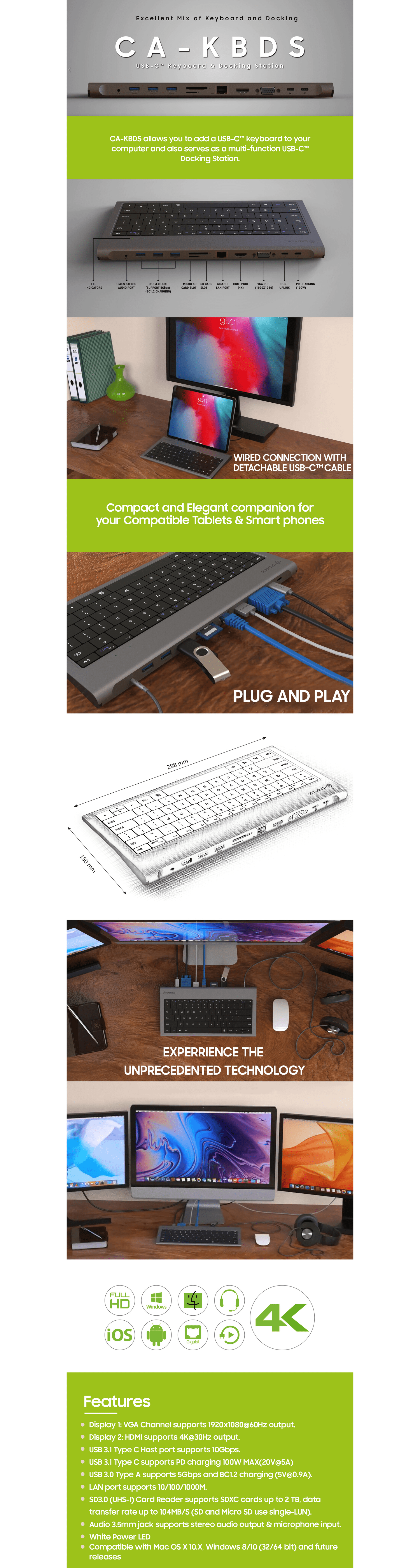 | Features | Display 1= VGA Channel supports 1920×1080@60Hz output. Display 2= HDMI supports 4K@30Hz output. USB 3.1 Type C Host port supports 10Gbps. USB 3.1 Type C supports PD charging 100W MAX(20V@5A) . USB 3.0 Type A supports 5Gbps and BC1.2 charging (5V@0.9A). LAN port supports 10/100/1000M. SD3.0 (UHS-I) Card Reader supports SDXC cards up to 2 TB, data transfer rate up to 104MB/S (SD and Micro SD use single-LUN). Audio 3.5mm jack supports stereo audio output & microphone input. White Power LED . Compatible with Mac OS X 10.X, Windows 8/10 (32/64 bit) and future releases |