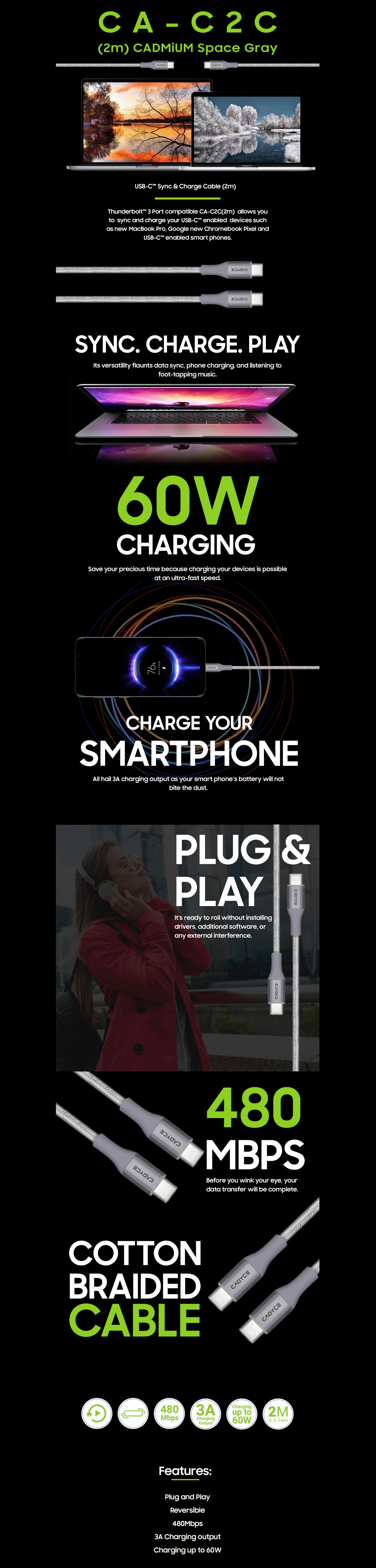 | Features | • Plug and Play • Reversible • 480Mbps • 3A Charging output • Charging up to 60W |