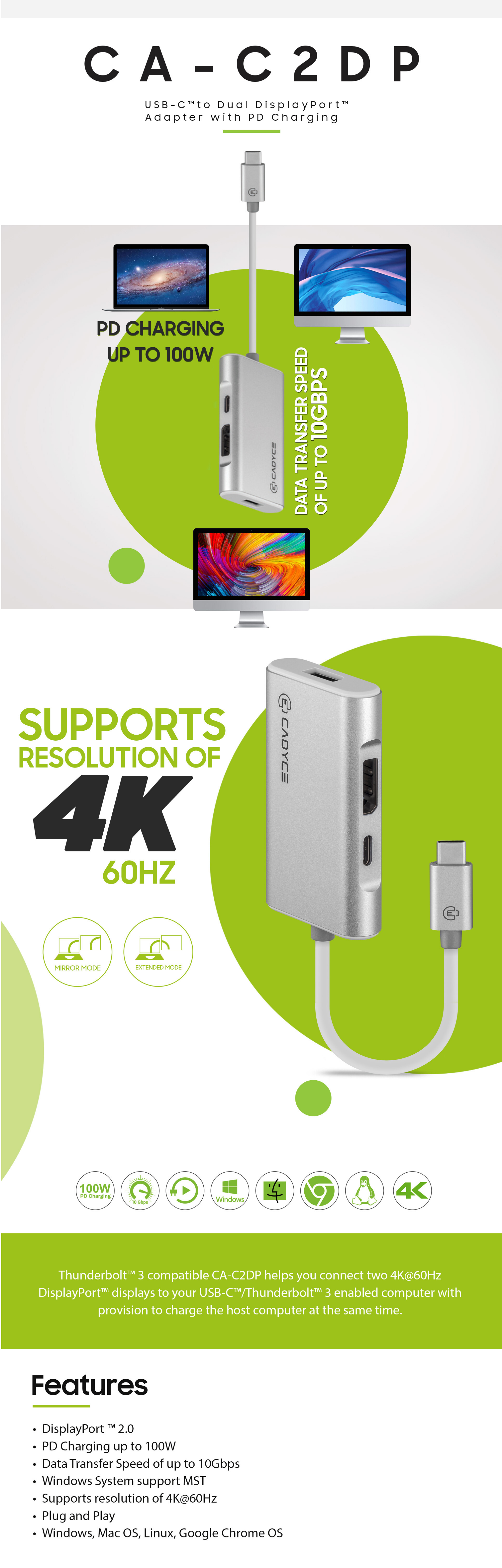 | Features | • Supports resolution of 4K@60Hz • Data Transfer Speed of up to 10Gbps • PD Charging up to 100W • Windows System support MST • Plug and Play • Windows, Mac OS, Linux, Google Chrome OS DisplayPort™ 2.0 |